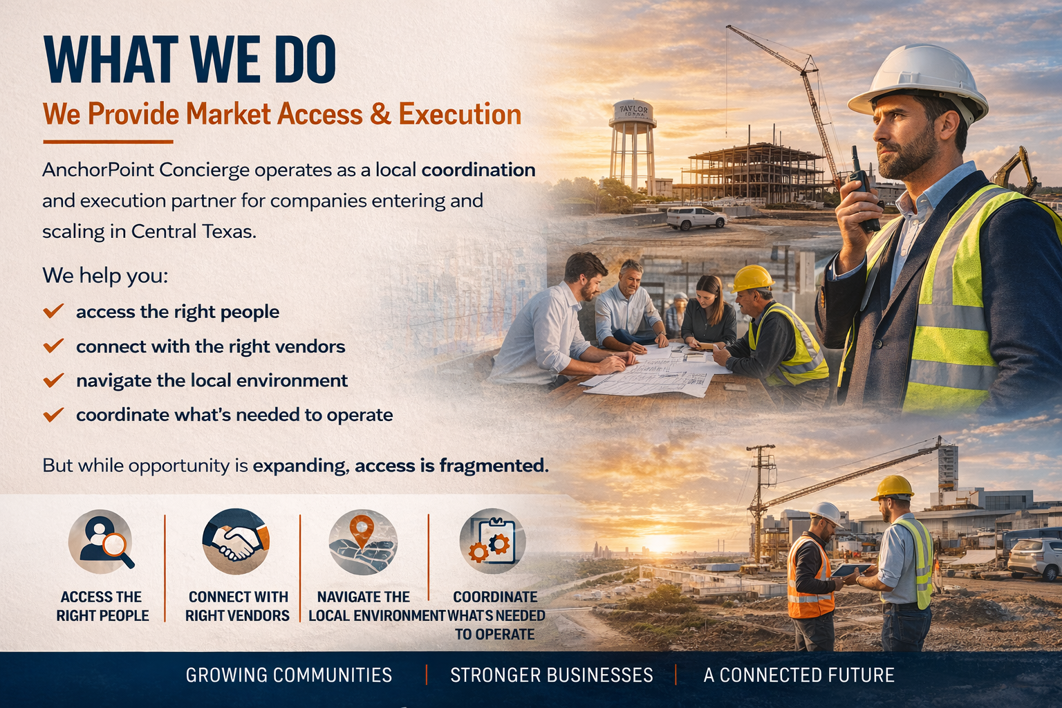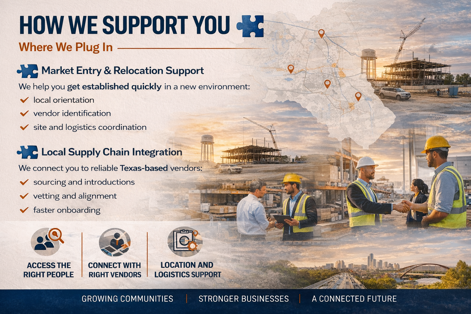 For Companies Operating in East Williamson County -- Built for organizations that need to move fast in a rapidly expanding industrial market. We connect workforce, vendors, and resources—so your operation moves without delay. Built for companies that need to move fast in a rapidly expanding industrial market.